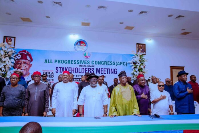 The endorsement took place during a high-profile APC Stakeholders’ Meeting held at the State Banquet Hall, Government House, Asaba. The meeting was attended by top political figures, including serving and former lawmakers, commissioners, local government chairmen, and party leaders from across Delta’s three senatorial districts.