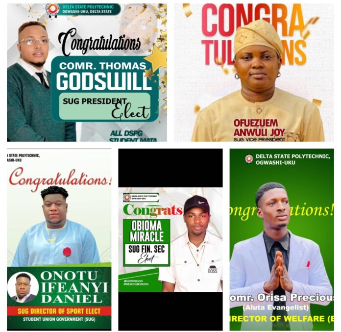 Ogwashi-Uku, Delta State — August 2, 2025 It was a day of victory, excitement, and unity at Delta State Polytechnic, Ogwashi-Uku (DSPG) as the winners of the Students’ Union Government (SUG) and National Association of Delta State Students (NADESSTU) elections were officially announced for the 2025/2026 academic session.