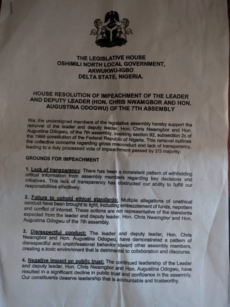 However, checks by this reporter revealed that copies of the House Resolution approving the impeachment of Hon. Chris Nwamgbor (Leader) and Hon. Augustina Odogwu (Deputy Leader) of the 7th Assembly were sighted.