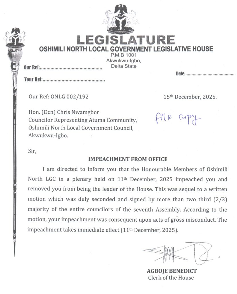 A serious leadership crisis has engulfed the Oshimili North Local Government Legislative Arm in Delta State following the impeachment of the Leader and Deputy Leader of the House, a development that has sparked sharp disagreements among councillors and raised questions about due process, governance, and accountability.