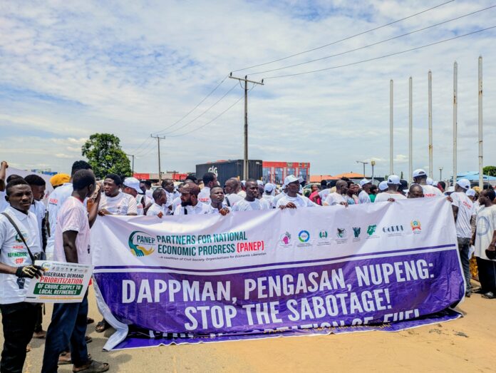 Other inscriptions on the placards read: “Nigerians, backed by foreign businesses, killed the textile industry,” and “PENGASSAN, NUPENG, DAPPMAN, stop sabotaging the petroleum downstream sector.”